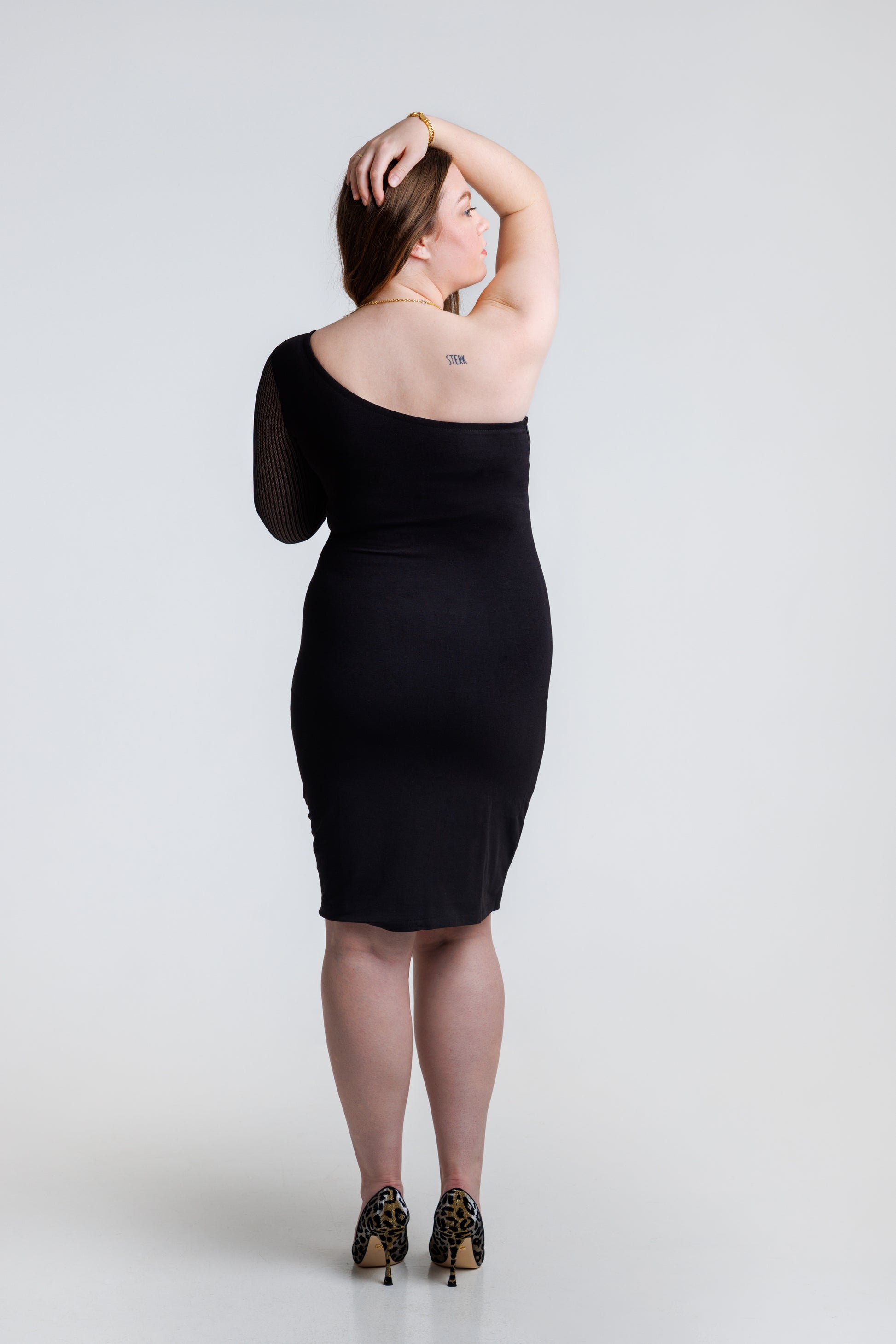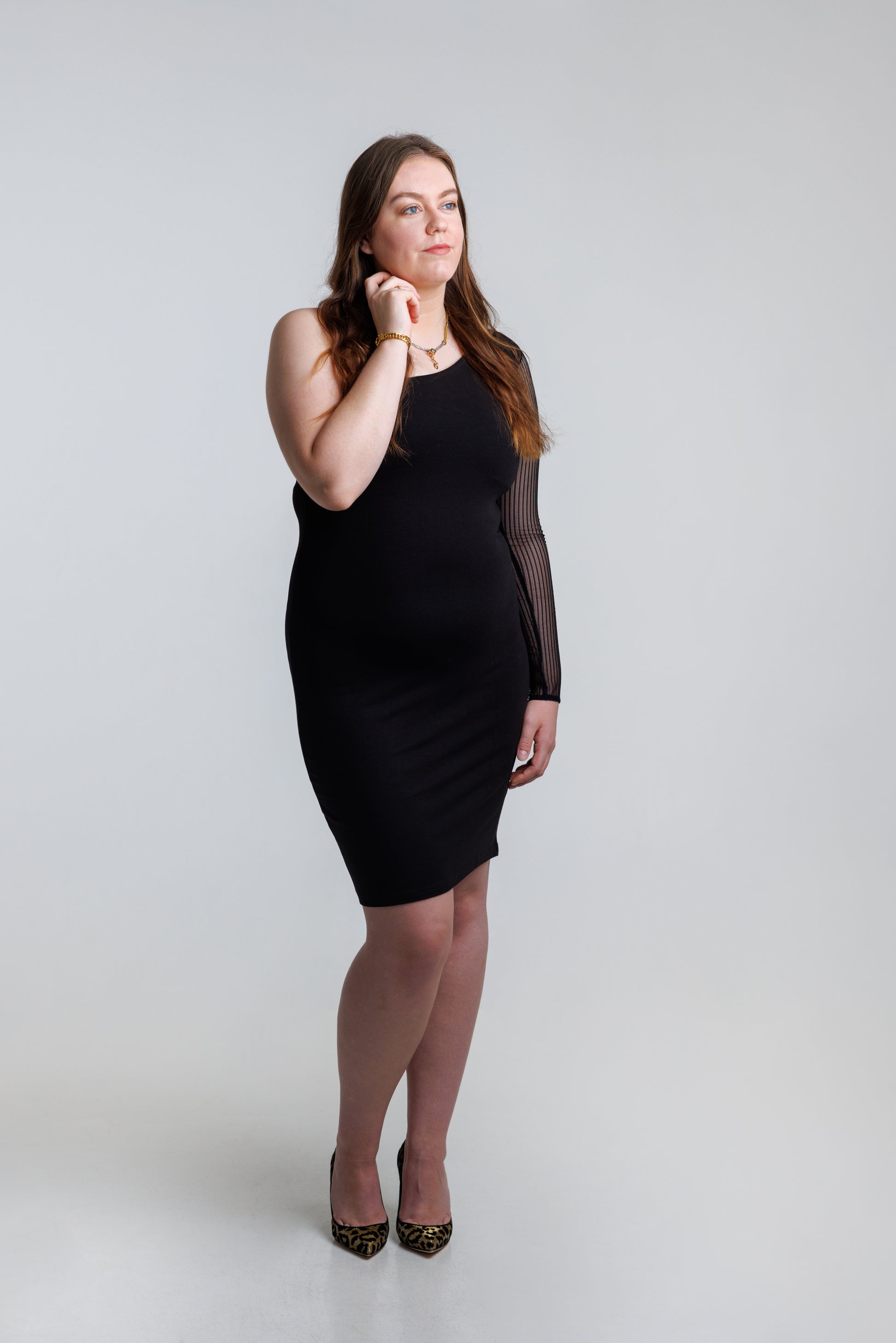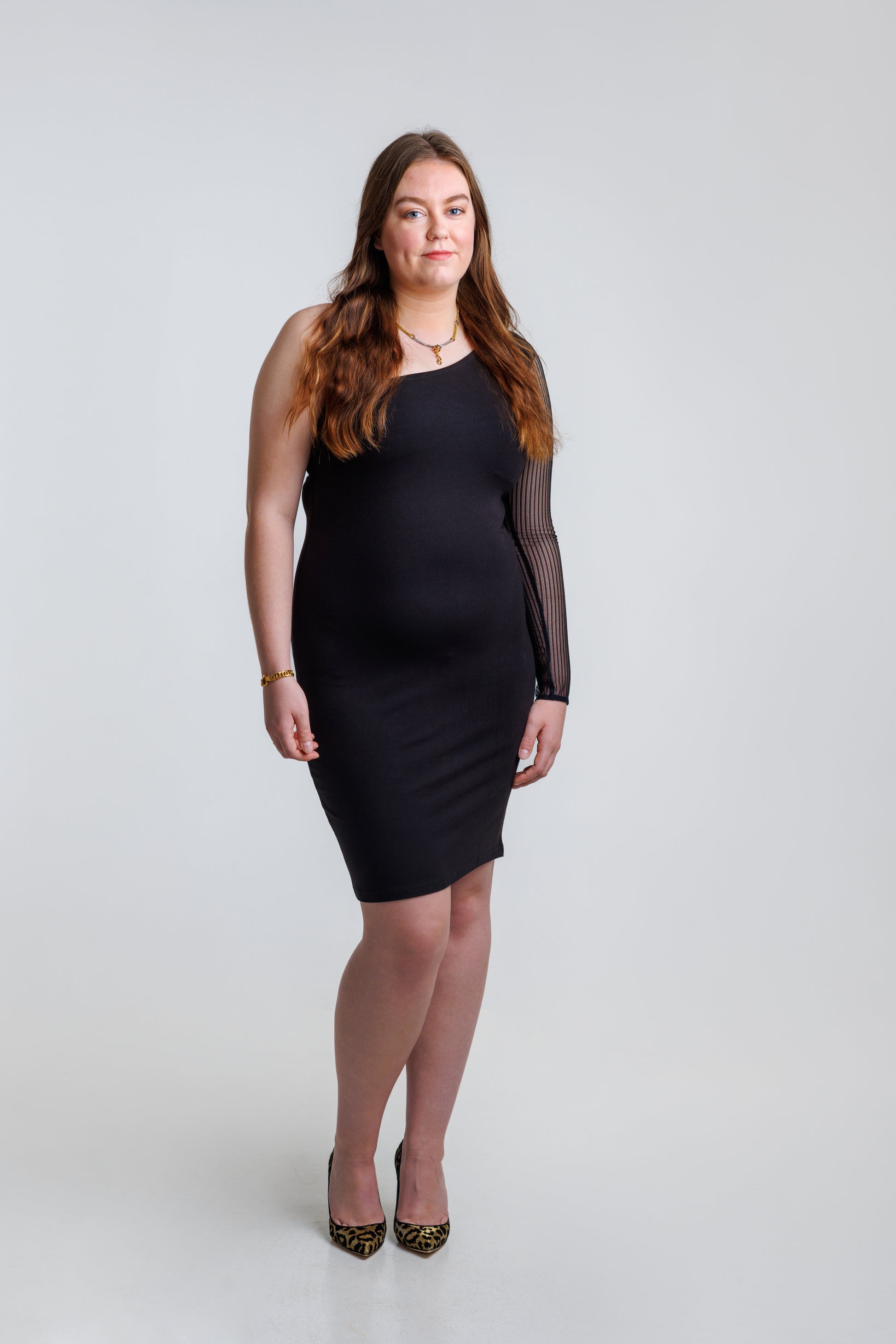 Imponerende asymmetrisk kjole med én skulder og et tilpasset snitt, laget av komfortabelt strikket materiale. Kjolen har lange ermer i svart, gjennomsiktig mesh med et stripet mønster. En dekket glidelås på venstre side gjør den enkel å ta på. Produsert i EU. Modellen har på seg størrelse M.